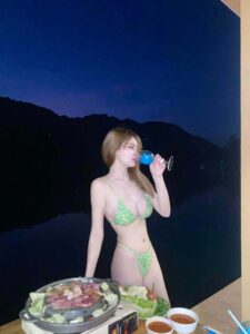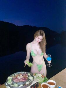 แต่ชุดที่ใส่ไปกินนี่แหละไม่ธรรมดา เป็นการกินหมูกระทะบนแพ แต่บอกเลยว่าเกินต้านมาก ชุดว่ายน้ำ ทูพีช สีเขียวอ่อน กินหมูกระทะกลางแพกลางแม่น้ำ ถือว่าเป็นภาพที่หาดูได้ยากมาก ไม่เท่านั้น บิกินี่ ที่มันรั้งขาสูง รัดเป้าจนเห็นขึ้นรูปมาเลย ต้องยอมรับเลยว่าดี